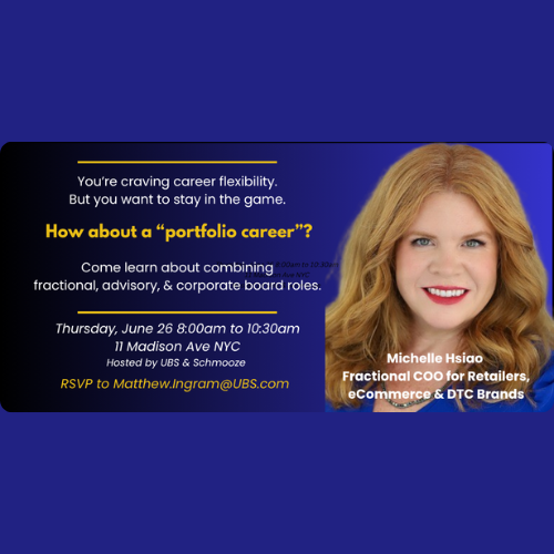 Michelle spoke on her role as a Fractional COO for brands and ecommerce retailers. She shared how she evolved her big corporate experience and success to the impactful and flexible career of a fractional. She discussed the role she plays within the businesses she serves, the benefits and drawbacks of fractional work.